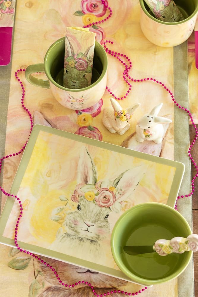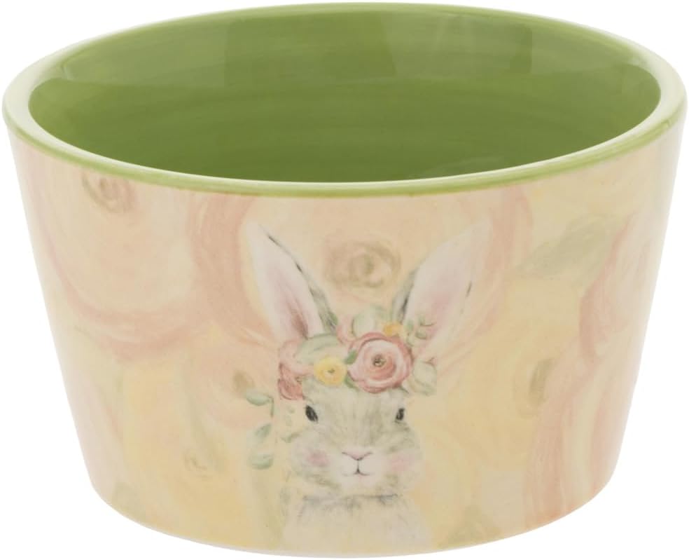 Bring whimsical charm to the table with this dolomite bowl adorned in soft florals and a sweet bunny wearing a flower crown, complemented by a glossy green interior. A coordinating dolomite-handled spreader makes serving dips, jams, and soft cheeses effortless, turning everyday snacking into a little celebration. Approximate dimensions are 5 x 5 x 3 inches.