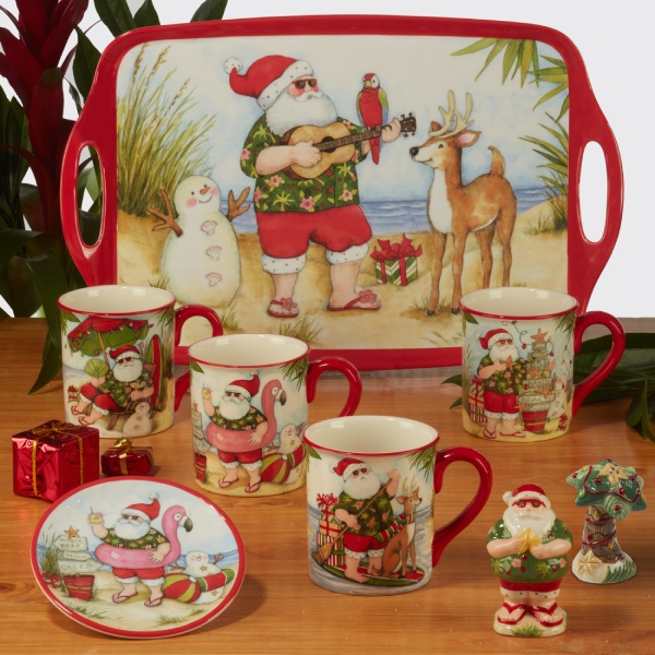 Colorful scenes of Santa enjoying his well-earned vacation at the beach decorate certified international's "Santa's Wish" collection of melamine dinnerware, serve ware, ceramic mugs, 3-D S & P, and cookie jar. Designed by the popular artist Susan Winget, this mix and match assorted images of Santa in his tropical shirt, sunglasses, and flip flops will delight your family and friends.