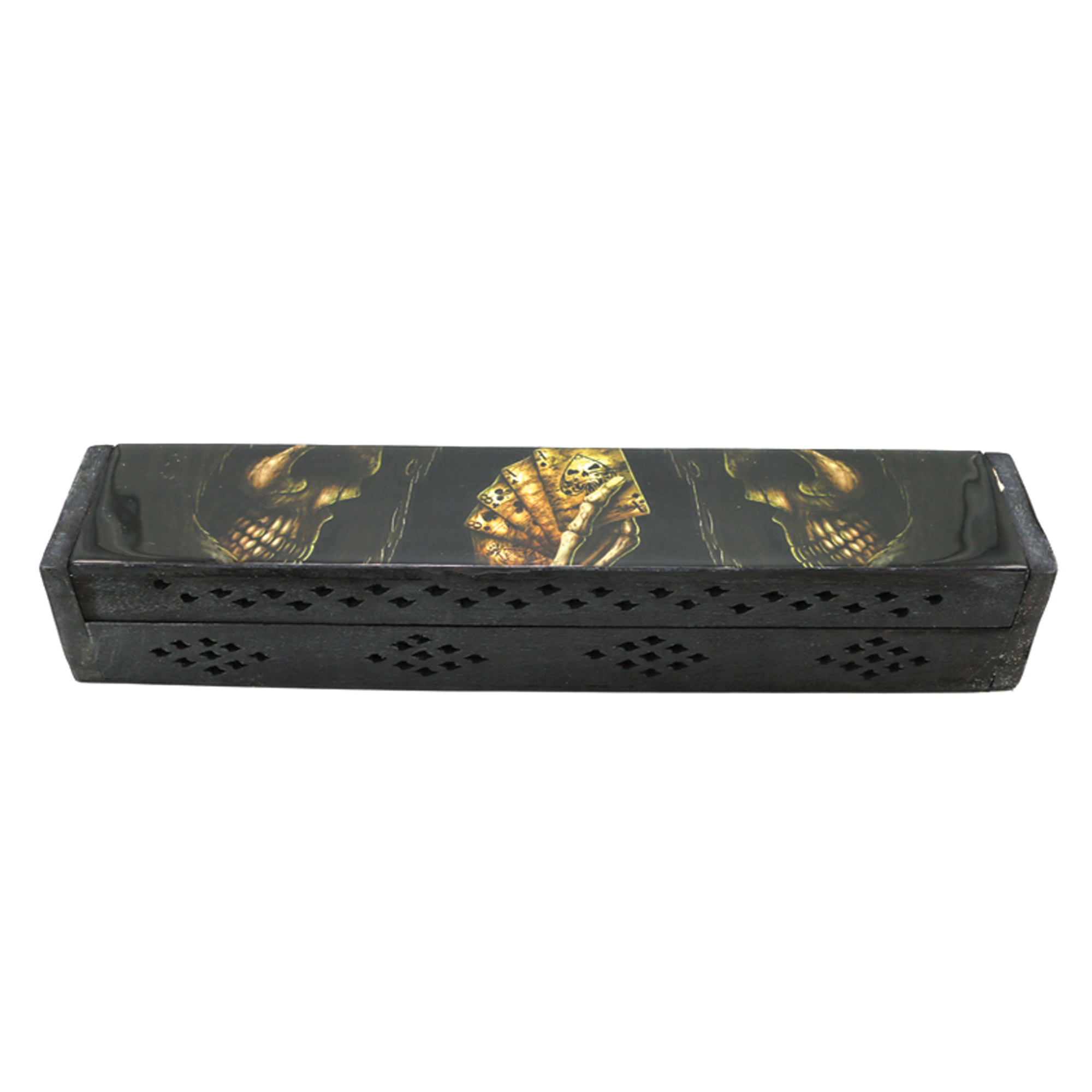 - Handcrafted 12″ coffin-shaped wooden box with a rich, stained finish.