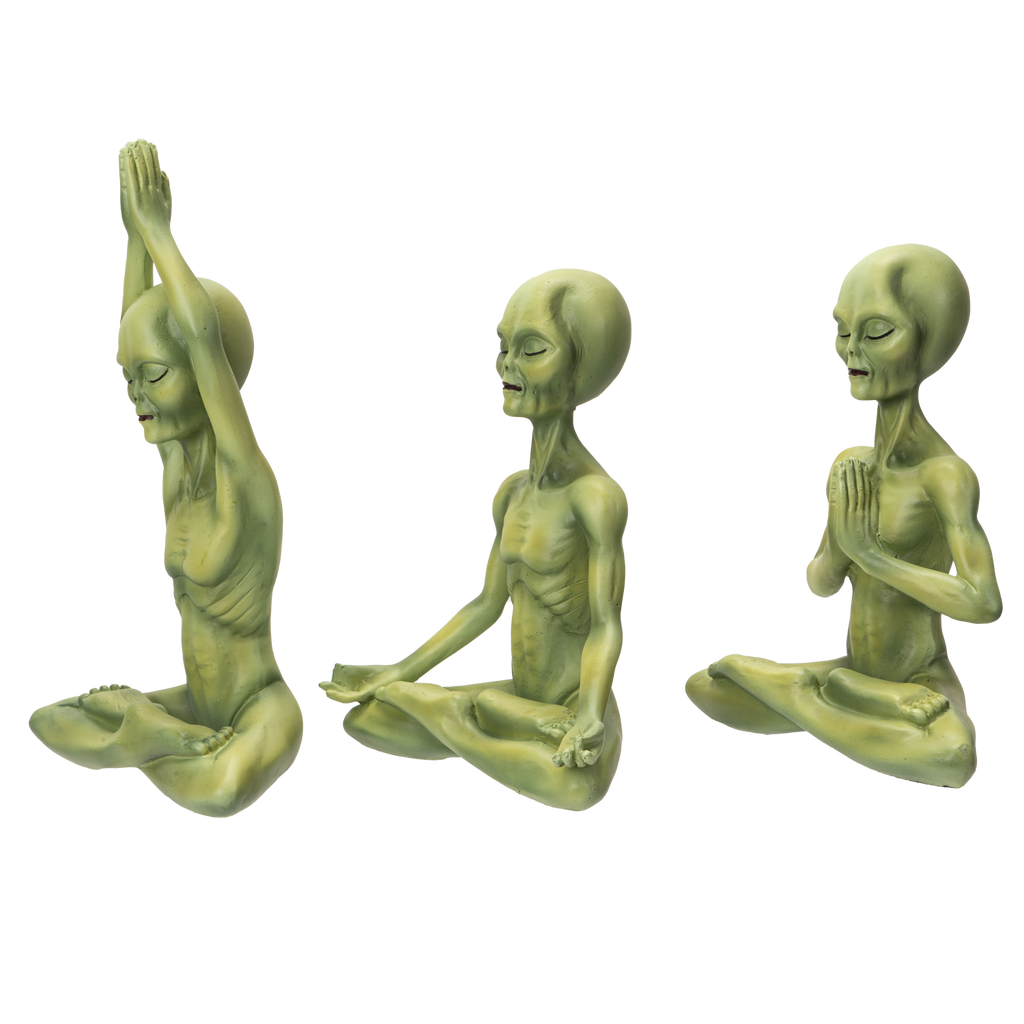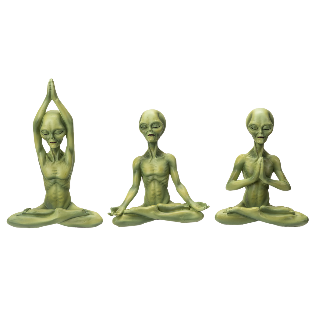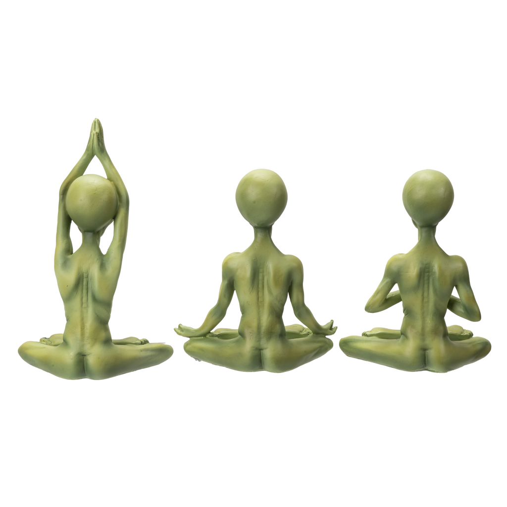 Yoga Poses figurines set of 3. Green Meditation Aliens in traditional yoga poses. Designed to spark conversation. This quirky piece brings a blend of sci-fi to your garden, patio, or home.